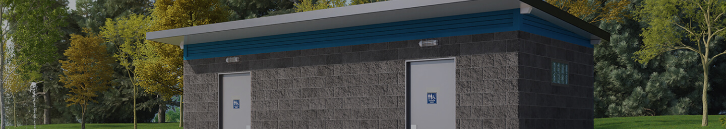 A large multi-stall model with a canopy. The restroom can be made larger to add stalls or unisex cabins. The Telluride comes with a total of five toilets, one urinal, and four sinks.