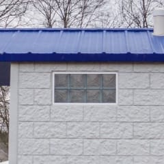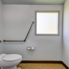 A large multi-stall model with a canopy. The restroom can be made larger to add stalls or unisex cabins. The Telluride comes with a total of five toilets, one urinal, and four sinks.
