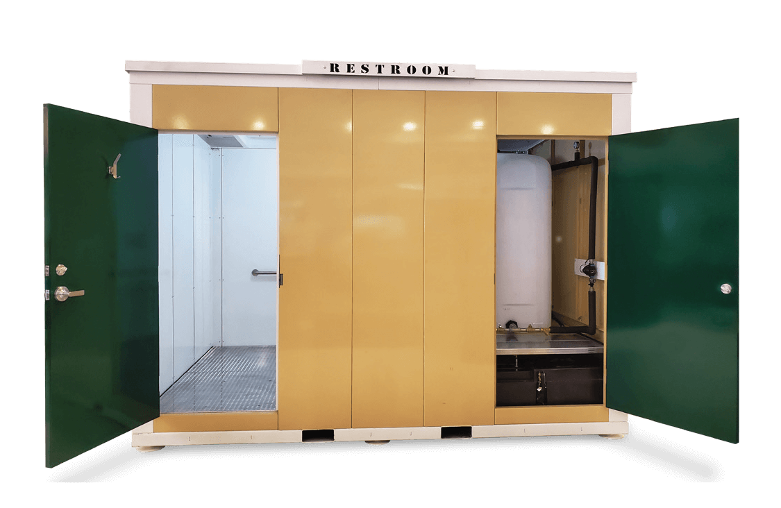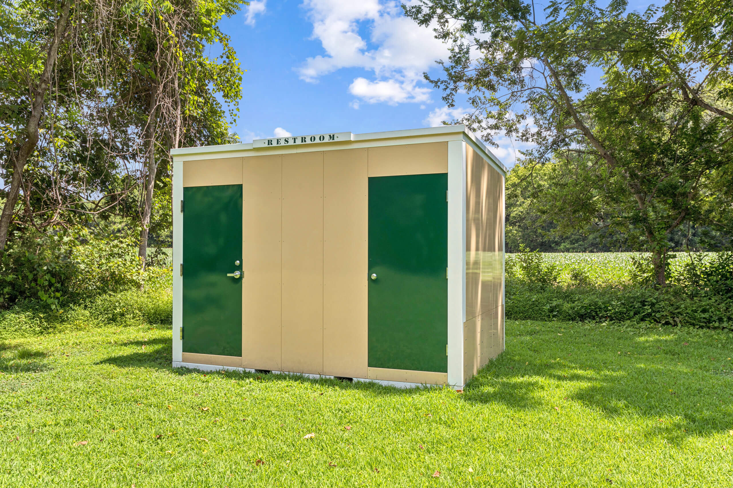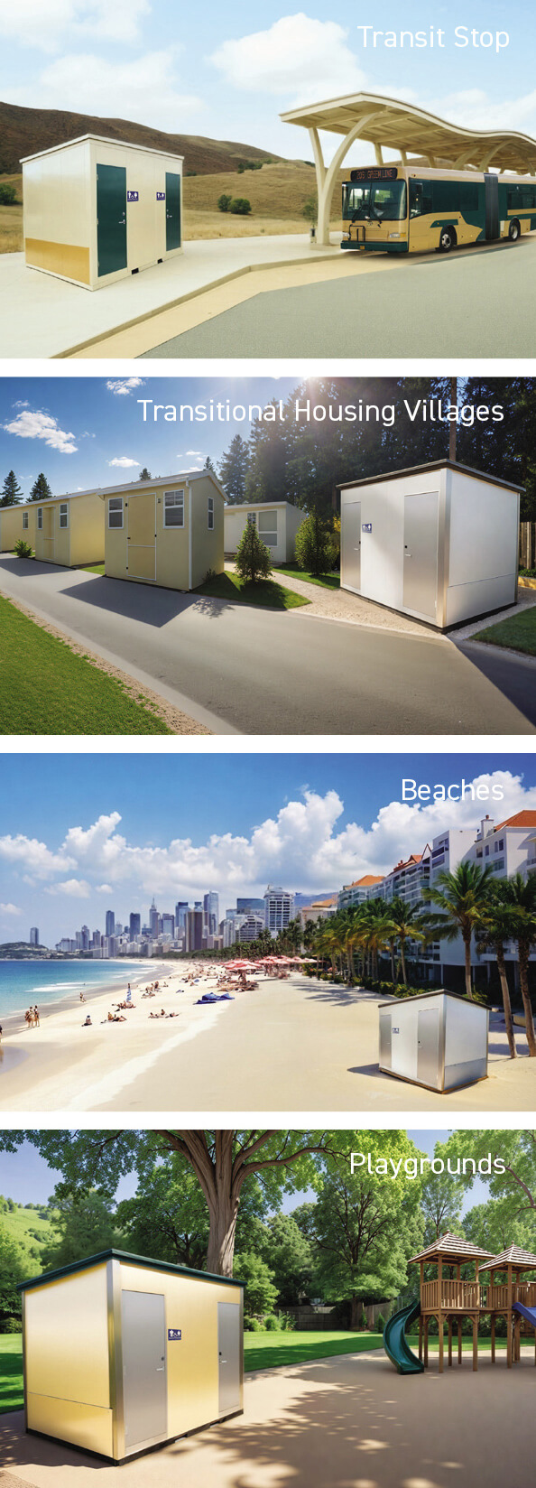 Steel can be substituted with aluminum for a rust-free restroom. Can be moved to high ground to avoid storm surges.